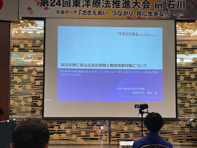 有資格者だけでなく、無資格者にも広告規制対象の範囲を広げた今回のガイドラインについて厚生省専門官がどのような話をするのかにとても興味がありました。(そもそも、あはき法が無資格を許していないのだから、ガイドライン以前の問題なのですが)